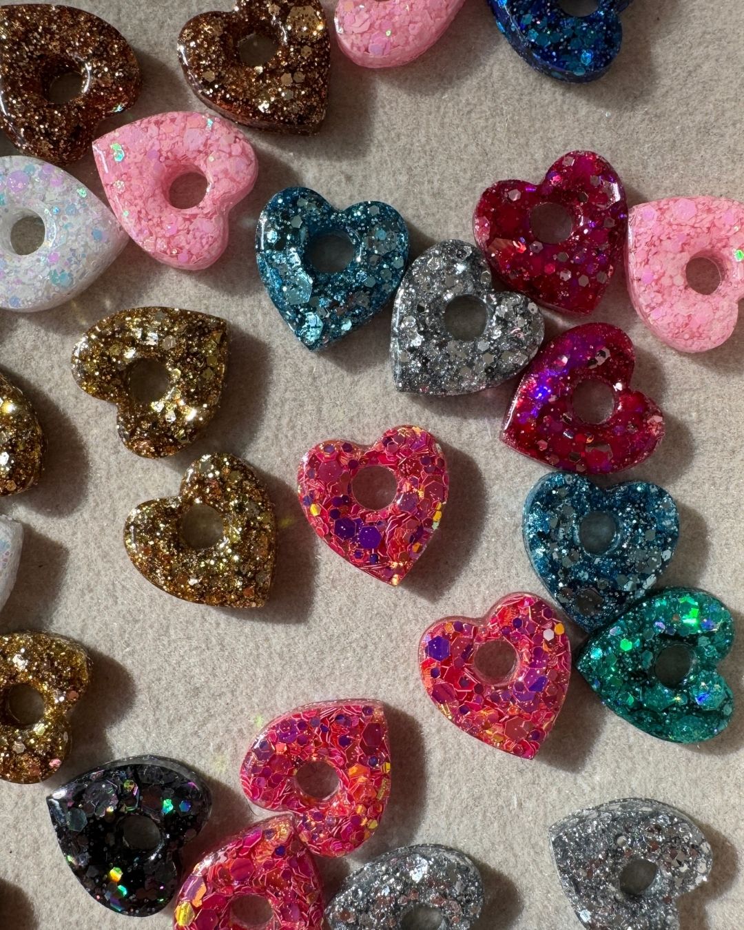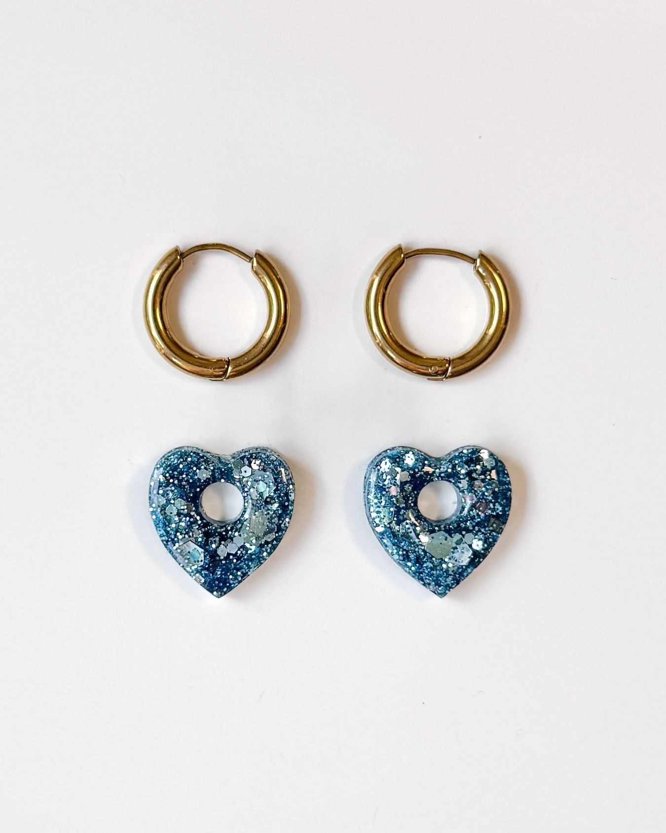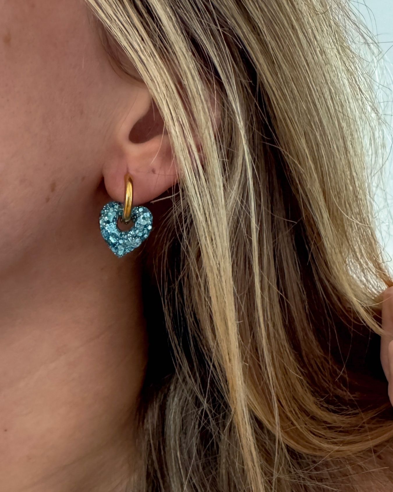 Chaque paire est sublimée par un coeur en résine pailletée, réalisé à la main dans mon atelier. Grâce à cette fabrication minutieuse, chaque coeur devient une pièce singulière. Les paillettes jouent avec la lumière et ajoutent une touche moderne à votre style.