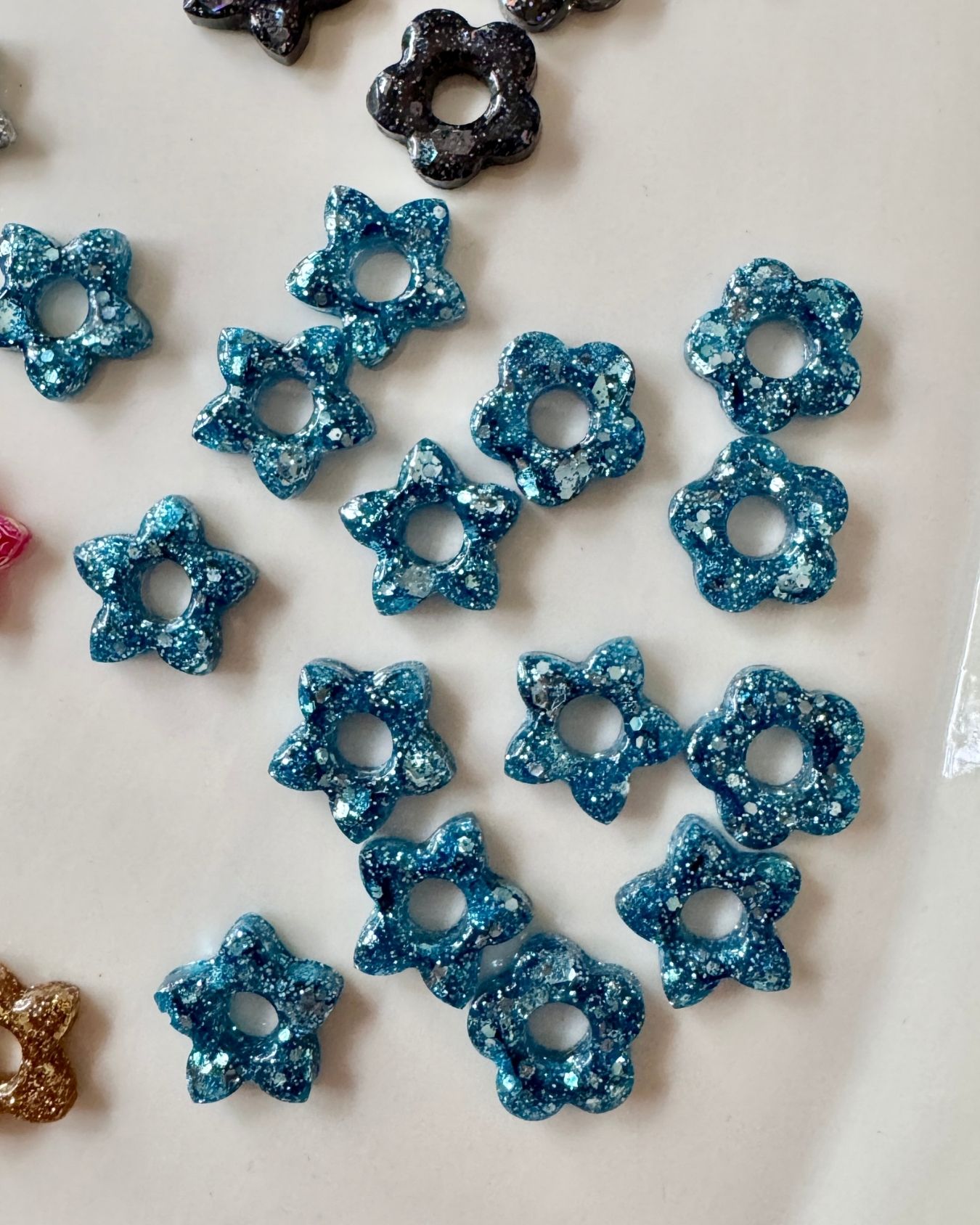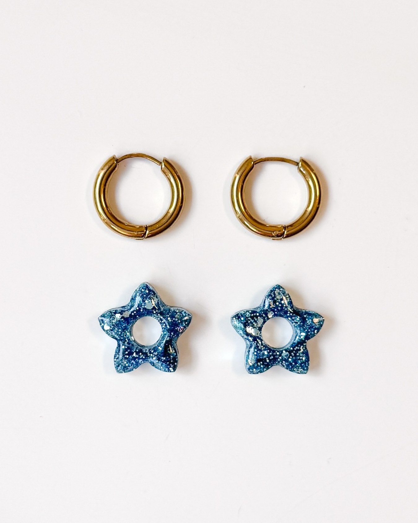 Chaque fleur bleue en résine pailletée est entièrement faite à la main dans mon atelier, ce qui garantit un rendu unique. En effet, la résine est coulée et façonnée avec précision, afin d’obtenir une brillance subtile. De plus, leur petite taille en fait un modèle polyvalent, adapté aux adultes comme aux enfants. Ainsi, ces mini créoles deviennent un accessoire raffiné pour un cadeau personnalisé ou un bijou du quotidien.
