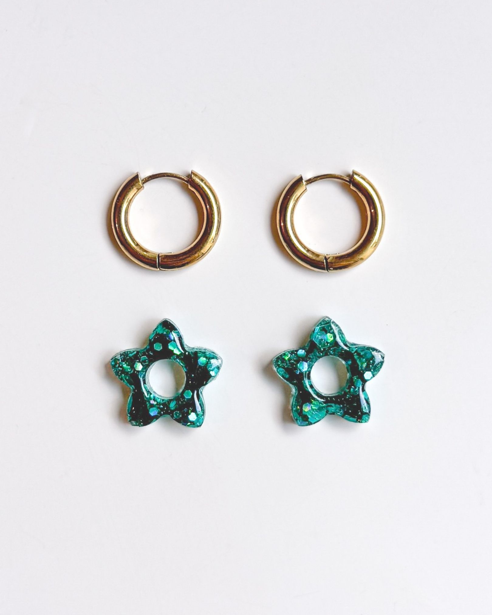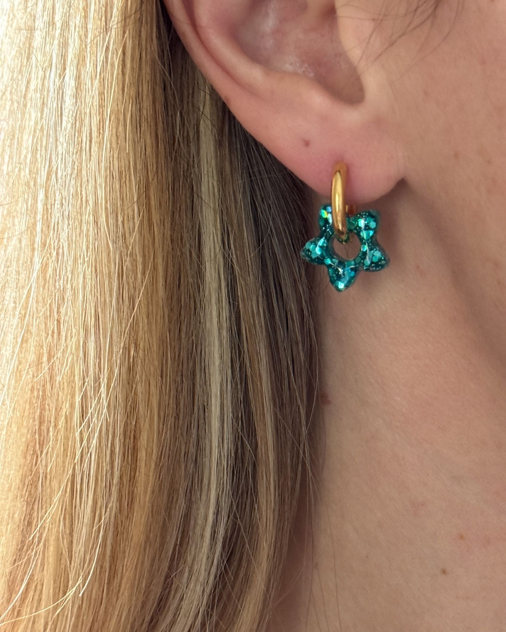 Chaque paire est ornée d’une fleur verte en résine pailletée, entièrement faite à la main dans mon atelier. Chaque fleur est coulé puis façonné individuellement, ce qui donne un rendu unique. Grâce à leur petite taille, ces mini créoles conviennent aussi bien aux adultes qu’aux enfants.