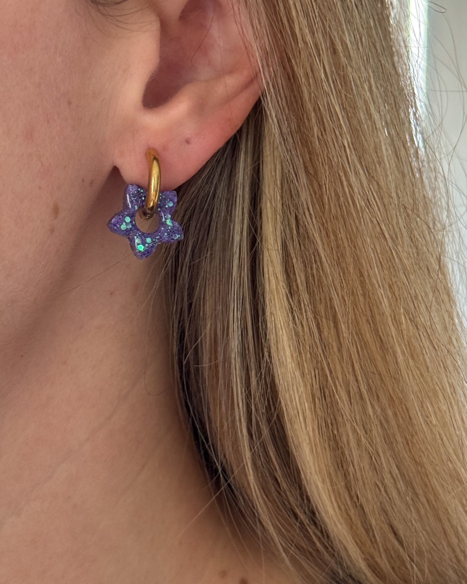 Chaque paire est ornée d’une fleur violette en résine pailletée, façonnée entièrement à la main dans mon atelier. Cette fabrication artisanale assure une finition unique, car chaque fleur est travaillé avec soin. Ainsi, la fleur reflète une brillance subtile et féminine qui attire immédiatement le regard. Grâce à leur petite taille, ces mini créoles conviennent aussi bien aux adultes qu’aux enfants.